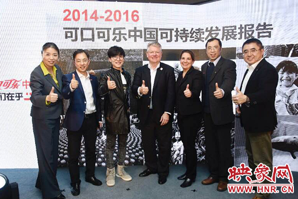 可口可樂中國攜手合作伙伴發(fā)布2014-2016可持續(xù)發(fā)展報告(左起:可口可樂大中華及韓國區(qū)副總裁張華瑩、壹基金秘書長李勁、創(chuàng)作型歌手王嘯坤、可口可樂大中華及韓國區(qū)總裁馮廣晟、世界自然基金會全球淡水項目高級官員Judy Takas、世界自然基金會中國淡水項目總監(jiān)任文偉博士、可口可樂大中華及韓國區(qū)副總裁張建弢)