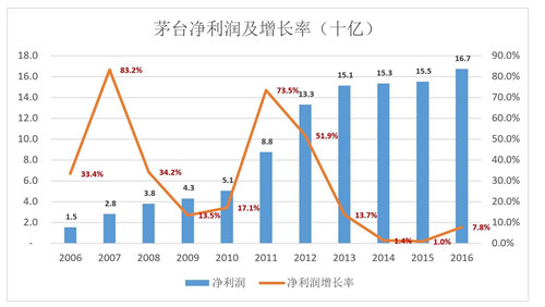 2006-2016年,茅臺營收平均年復(fù)合增長率為26.9%。但最近3年,凈利潤同比增幅都是“個位數(shù)”:1.4%、1.0%、7.8%……