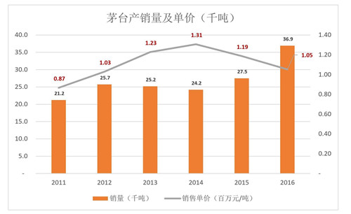 茅臺先后上馬“十一五”和“十二五”兩個萬噸茅臺酒工程。2011年,茅臺酒及系列酒基酒產(chǎn)量接近4萬噸:2016年達6萬噸(其中茅臺酒基酒為3.93萬噸);2016年產(chǎn)量為2005年產(chǎn)量的376%,年均復(fù)合增長率12.8%。