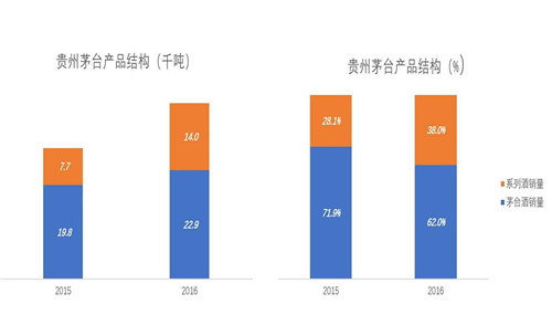 貴州茅臺將產(chǎn)品分為兩大類:茅臺酒、其他系列酒(茅臺王子酒、茅臺迎賓酒、賴茅酒等)。2016年,兩類產(chǎn)品銷量分別為2.3萬噸和1.4萬噸,同比增幅分別為15.76%和81.69%。#5700多億市值由2.3萬噸茅臺酒撐起#