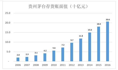 值得注意的是,貴州茅臺存貨以生產(chǎn)成本入賬。假如毛利潤率為90%,206.2億存貨的出廠價將達2062億,相當(dāng)于2016年營收的5.3倍。