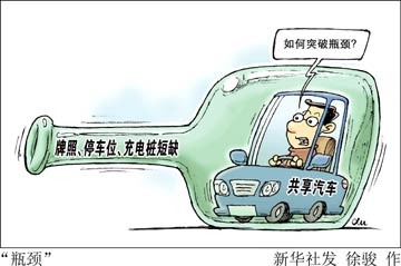 牌照、停車(chē)位、充電樁成為制約共享汽車(chē)行業(yè)發(fā)展的三大瓶頸,需要各方協(xié)同創(chuàng)新以促進(jìn)產(chǎn)業(yè)可持續(xù)發(fā)展。新華社發(fā) 徐駿/作