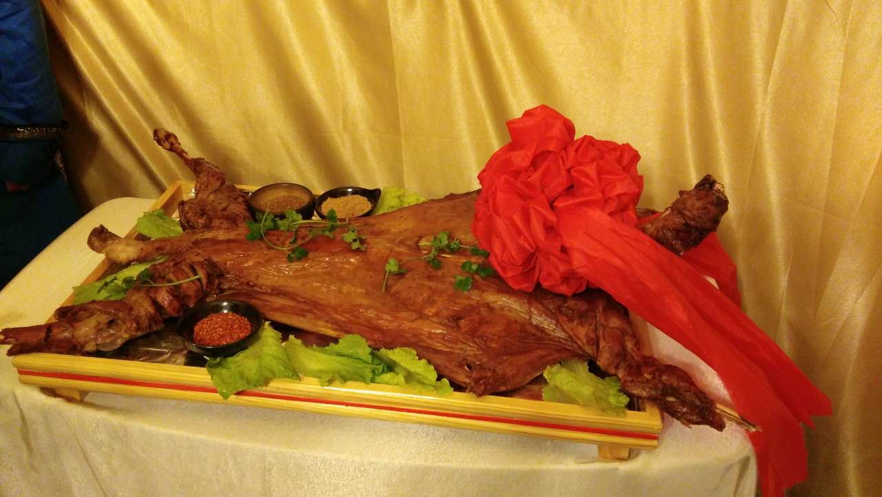 只一道烤全羊,酒店大廚都頗費(fèi)工夫。食材精選肉質(zhì)鮮嫩的鮮羊,肉質(zhì)均勻。因?yàn)閷Α霸丁钡臉O致追求,整只羊需提前三個(gè)小時(shí)炭火慢慢烤制??救蛏舷螅珴山瘘S,表皮脆嫩,鮮香襲人,令人垂涎欲滴。此時(shí),酒店工作人員會為當(dāng)晚最尊貴的客人獻(xiàn)上哈達(dá),并邀請客人一起舉行“開羊儀式”,在蒙古,這象征主人對朋友最誠摯的祝福。