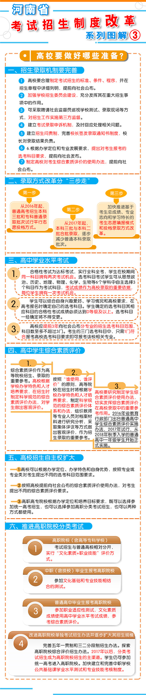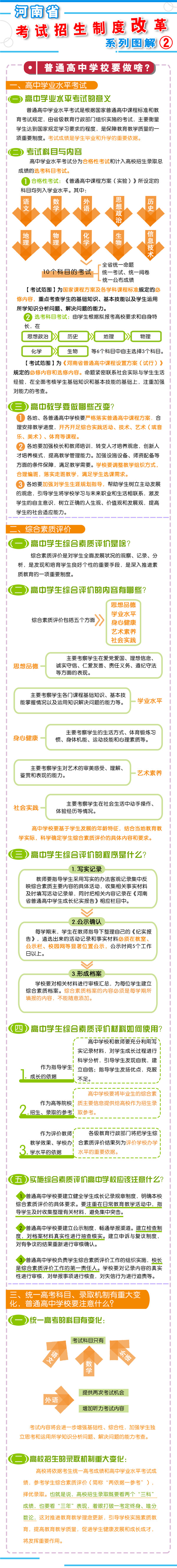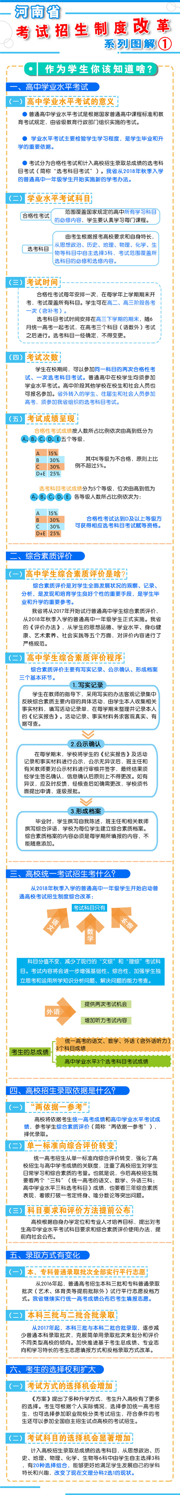 8月23日上午9時,河南省教育廳召開新聞通氣會,通報了《河南省深化考試招生制度改革實施方案》(以下簡稱《方案》)的有關(guān)情況?! “凑铡斗桨浮芬?,我省從2018年秋季入學(xué)的普通高中一年級學(xué)生開始啟動高考綜合改革,考生總成績由統(tǒng)一高考的語、數(shù)、外3科成績和高中學(xué)業(yè)水平3個選考科目成績組成。招生錄取實行基于統(tǒng)一高考成績和高中學(xué)業(yè)水平考試成績、參考學(xué)生綜合素質(zhì)評價擇優(yōu)錄取機制?! ?strong>總體目標  到2020年,初步形成分類考試、綜合評價、多元錄取的考試招生模式,進一步健全促進公平、科學(xué)選才、監(jiān)督有力的體制機制,構(gòu)建順應(yīng)時代要求、符合教育規(guī)律和河南省情的考試招生制度?! ?strong>主要任務(wù)  一、促進升學(xué)機會公平  逐步增加我省考生接受優(yōu)質(zhì)高等教育的機會,逐步增加農(nóng)村學(xué)生升入重點高校人數(shù),減少和規(guī)范高考加分,完善中小學(xué)招生辦法?! ?strong>二、改革考試形式和內(nèi)容  完善高中學(xué)業(yè)水平考試??荚嚪譃楹细裥钥荚嚭陀嬋敫咝U猩浫】偝煽兊倪x考科目考試(簡稱“選考科目考試”)。合格性考試范圍覆蓋國家規(guī)定的高中所有學(xué)習(xí)科目的必修內(nèi)容。選考科目由考生根據(jù)報考高校要求和自身特長,從思想政治、歷史、地理、物理、化學(xué)、生物等科目中自主選擇3科。學(xué)生在校期間,可以參加同一科目的兩次合格性考試、一次選考科目考試?! ∵M一步規(guī)范高中學(xué)生綜合素質(zhì)評價。建立全省規(guī)范統(tǒng)一的高中學(xué)生綜合素質(zhì)檔案,完善學(xué)生綜合素質(zhì)評價電子化管理平臺,客觀記錄學(xué)生成長過程中的真實表現(xiàn),確保程序嚴格、公開透明、內(nèi)容真實可信?! ⊥七M高職院校分類考試。高職院校(含高等專科學(xué)校)考試招生與普通高校相對分開,實行“文化素質(zhì)+職業(yè)技能”評價方式。中職(含技校)畢業(yè)生報考高職院校,參加文化基礎(chǔ)和專業(yè)技能相結(jié)合的測試。普通高中畢業(yè)生報考高職院校,參加職業(yè)適應(yīng)性測試,文化素質(zhì)成績使用高中學(xué)業(yè)水平考試成績,參考綜合素質(zhì)評價?! ∩罨荚噧?nèi)容改革。依據(jù)國家高中課程標準和高校人才選拔、培養(yǎng)要求,科學(xué)設(shè)計命題內(nèi)容,增強基礎(chǔ)性、綜合性,突出能力、創(chuàng)新導(dǎo)向,著重考察學(xué)生獨立思考和運用所學(xué)知識分析問題、解決問題的能力?! ?strong>三、改革招生錄取機制  完善招生選拔機制。高校要合理確定考試招生的標準、條件、程序等內(nèi)容,在招生章程中詳細列明并提前向社會公布。要加強學(xué)校招生委員會建設(shè),充分發(fā)揮其在重大招生事項中的作用。建立考試錄取申訴機制和招生問責(zé)制,校長對錄取結(jié)果負責(zé)。  改革錄取方式。從2017年起,本科三批與本科二批合批錄取,逐步減少普通本科錄取批次,克服簡單用錄取批次來劃分和評價不同類型高校的傾向。加快推進基于考生總成績、專業(yè)志向和學(xué)習(xí)特長的考生志愿填報方式和投檔錄取方式改革?! ?strong>四、改革監(jiān)督管理機制  加強信息公開,全面實施高校招生“陽光工程”,進一步擴大信息公開的范圍和內(nèi)容。強化考試安全,堅持從嚴治考,完善考試招生誠信制度,落實誠信結(jié)果使用要求。加大違規(guī)查處力度,加強考試招生全程監(jiān)管,嚴厲打擊和嚴肅查處考試招生中的違法違規(guī)行為,及時公布查處結(jié)果,嚴格責(zé)任追究。  五、2018年秋季開始實施  從2018年秋季入學(xué)的普通高中一年級學(xué)生開始啟動普通高??荚囌猩贫染C合改革?! ≡诟母锟荚嚳颇吭O(shè)置上,不分文理科,外語科目提供兩次考試機會??忌目偝煽冇山y(tǒng)一高考的語文、數(shù)學(xué)、外語(含外語聽力)3個科目成績和高中學(xué)業(yè)水平3個選考科目考試成績組成。保持統(tǒng)一高考的語文、數(shù)學(xué)、外語分值不變。  在改革招生錄取機制上,推進基于統(tǒng)一高考成績和高中學(xué)業(yè)水平考試成績、參考學(xué)生綜合素質(zhì)評價的多元錄取機制改革。高校要根據(jù)自身辦學(xué)定位和專業(yè)人才培養(yǎng)目標,提出對考生高中學(xué)業(yè)水平考試科目要求和綜合素質(zhì)評價使用辦法,提前向社會公布?! ?016年省教育行政部門出臺普通高中學(xué)業(yè)水平考試實施辦法和普通高中學(xué)生綜合素質(zhì)評價實施辦法,從2018年秋季入學(xué)的普通高中一年級學(xué)生開始正式實施?! ?strong>省教育廳文件通知:  1、關(guān)于印發(fā)《河南省普通高中學(xué)業(yè)水平考試實施辦法(試行)》的通知  2、關(guān)于印發(fā)《河南省普通高中學(xué)生綜合素質(zhì)評價實施辦法(試行)》的通知  我省深化考試招生制度改革實施方案圖解:
