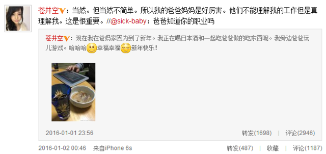 蒼井空回應(yīng)父親是否知其職業(yè):爸媽理解我