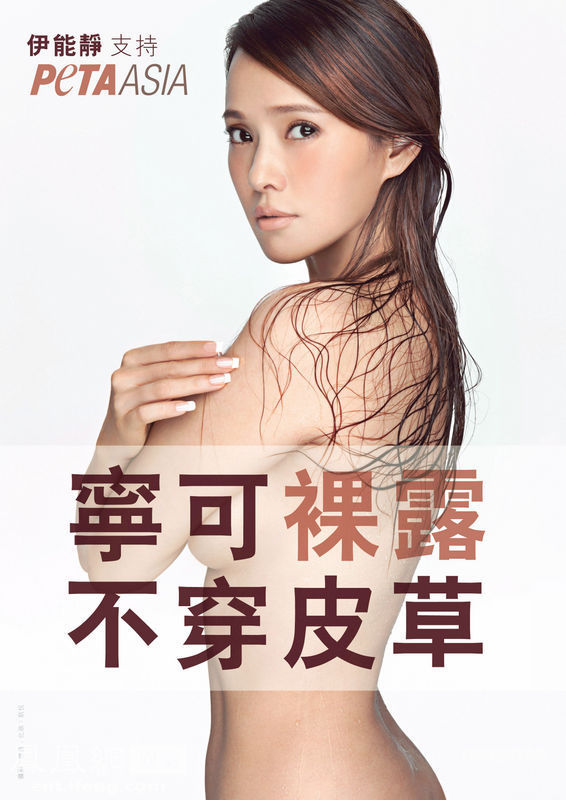 2012年3月8日,香港,44歲的伊能靜原本是皮草愛好者,曾收藏超過50件皮草,不過她為了反皮草,加入善待動(dòng)物組織知名的“寧可裸露,不穿皮草”活動(dòng)。她上半身全裸入鏡拍攝反皮草廣告時(shí),一絲不掛只用雙臂抱著34D秀胸入鏡,其中一張側(cè)面的照片,還露出股溝。