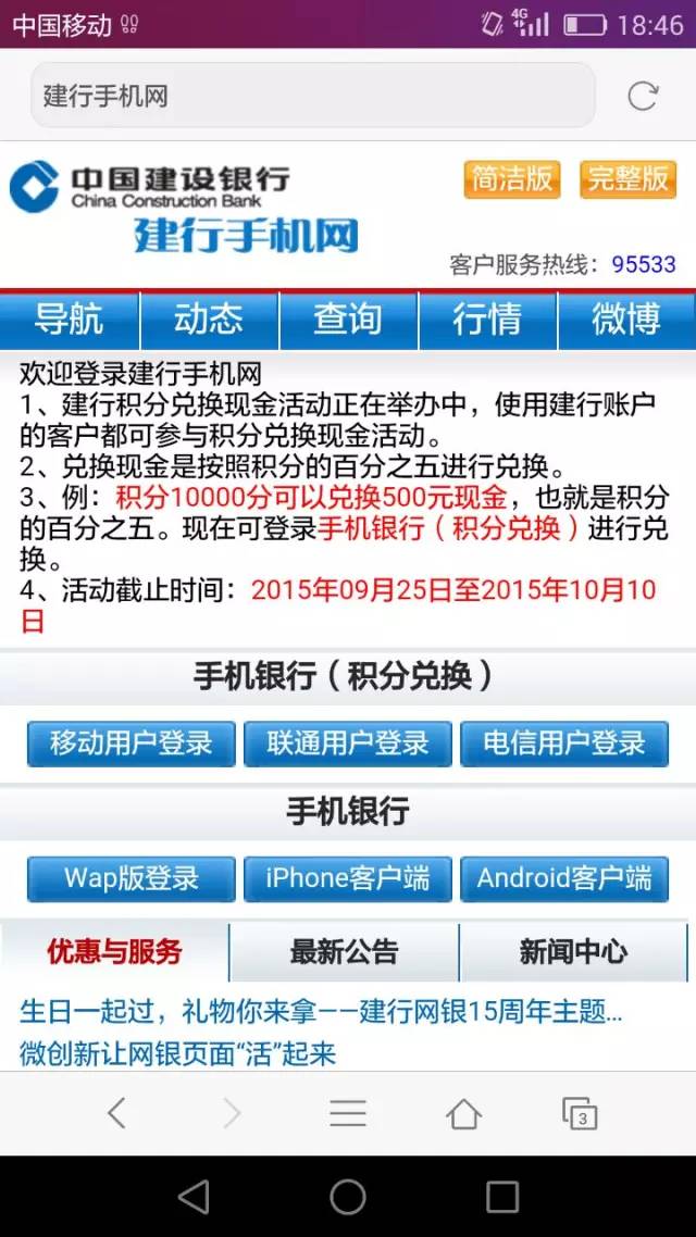 一萬積分兌換500元,簡(jiǎn)直是天上掉現(xiàn)金的感覺,于是便有市民心動(dòng)了,點(diǎn)擊了短信中的鏈接。這時(shí),手機(jī)跳轉(zhuǎn)到了一個(gè)上網(wǎng)界面,顯示是“建行手機(jī)網(wǎng)”。