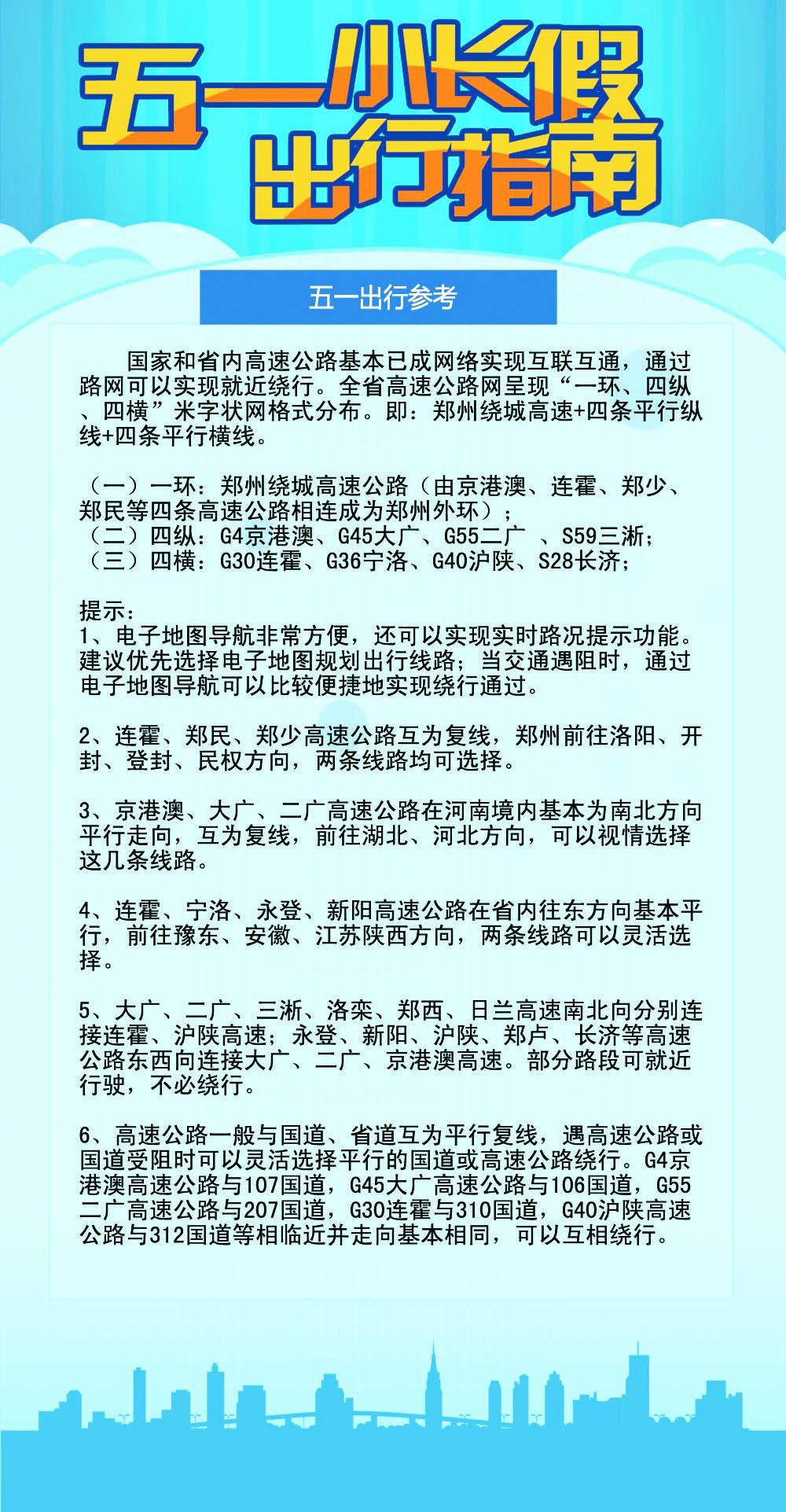 盡量避開假期第一天和最后一天的8時(shí)至11時(shí)、16時(shí)至19時(shí)兩個(gè)高峰時(shí)段,特別是假期最后一天5月3日下午是返程高峰時(shí)段。
