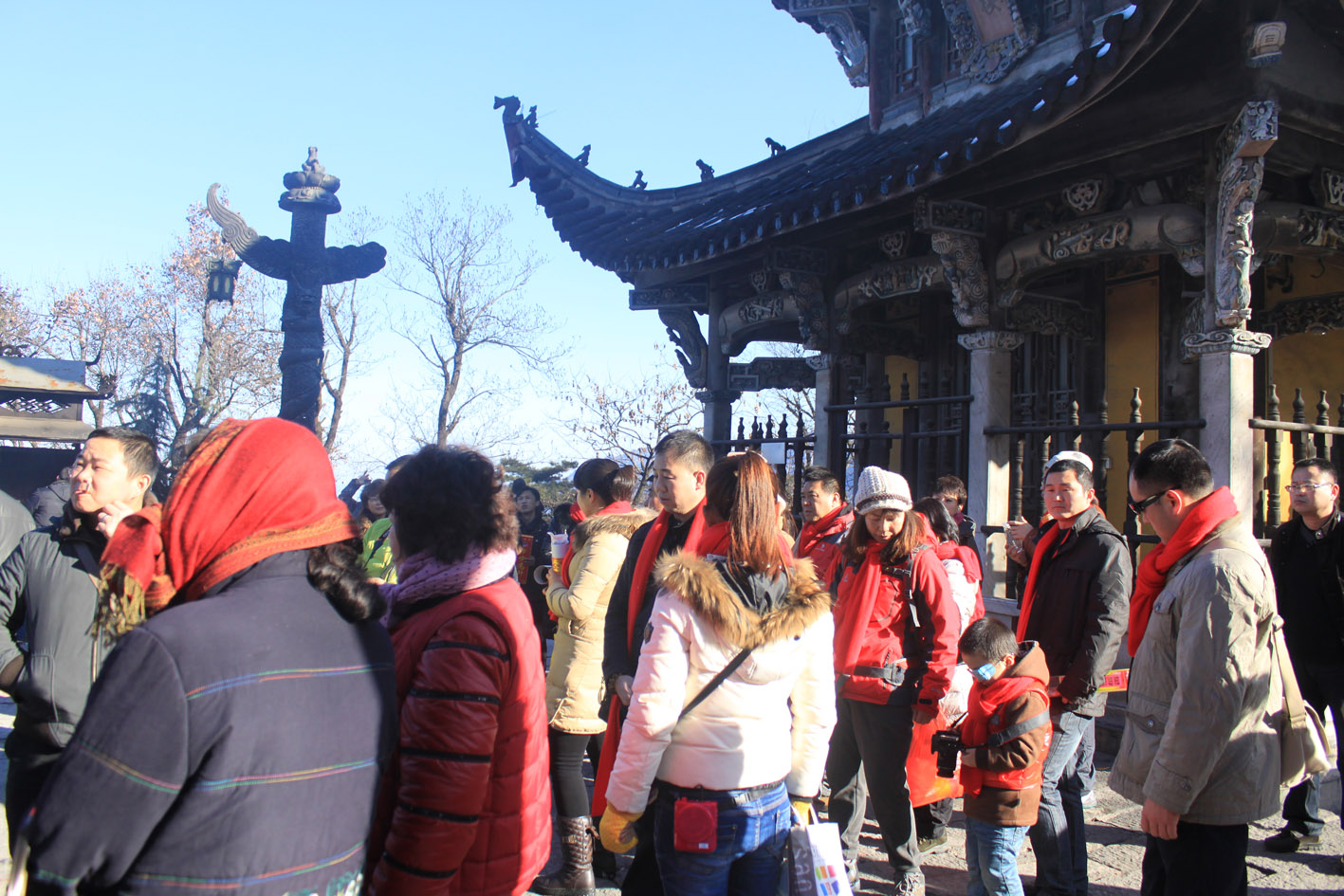 我們的自駕車隊(duì)12月31號抵達(dá)九華山之前,這里剛剛下過一場雪,湛藍(lán)色的天空、漫山遍野銀裝素裹,明黃色的寺廟在白雪的映襯下別有一番景致。在第一天登百歲宮時,大家相互鼓勵,并不時調(diào)侃氣氛,讓不少車友第一次感受到了雪中登山的樂趣。