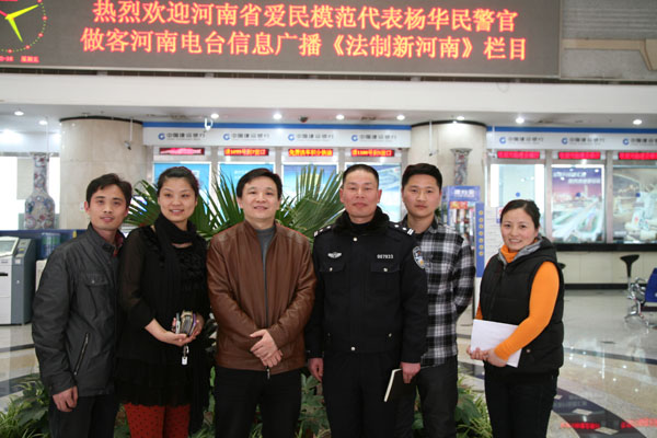 2012年3月16日下午四點(diǎn),中央電視臺(tái)攝制組進(jìn)入河南電臺(tái)信息廣播《法制新河南》節(jié)目直播間進(jìn)行了拍攝。在節(jié)目中做客的是全國愛民模范鄭州市花園路農(nóng)業(yè)路楊華民交通示范標(biāo)準(zhǔn)崗崗長楊華民。