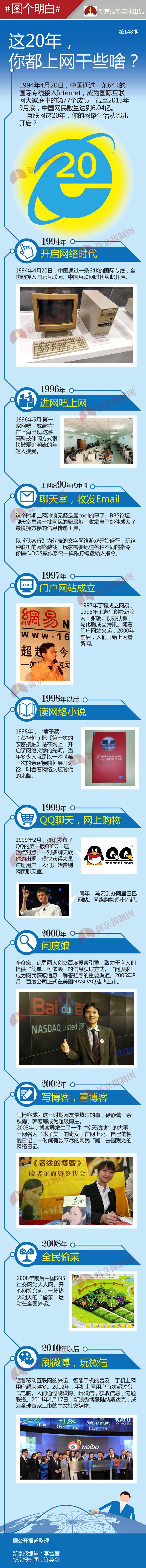 1994年4月20日,中國通過一條64K國際專線接入Internet,成為國際互聯(lián)網(wǎng)大家庭中的第77個成員。截至2013年9月底,中國網(wǎng)民數(shù)量達到6.04億。互聯(lián)網(wǎng)這20年,你的網(wǎng)絡(luò)生活從哪兒開啟?