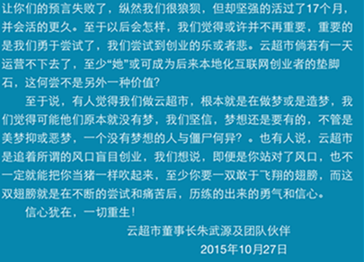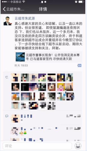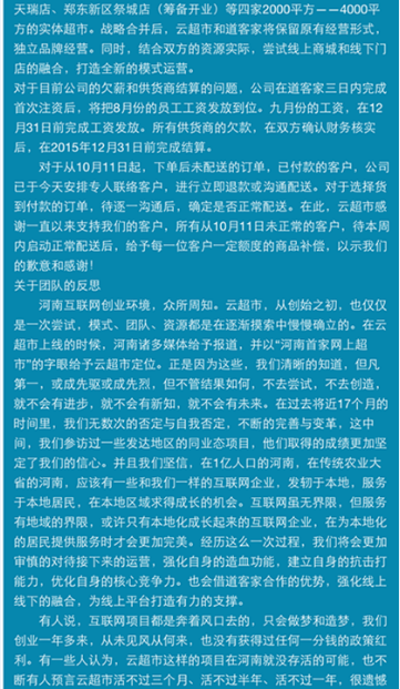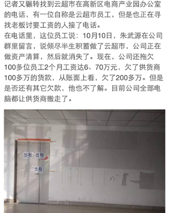 最近一周,在鄭州電商圈悄悄地流傳著這個(gè)消息……云超市倒閉了?董事長朱武源失聯(lián)了?讓我們看一下26號各媒體發(fā)出的消息: