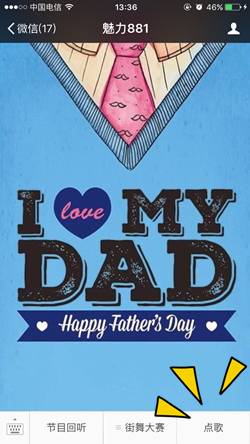 本周日就是父親節(jié)了。平時(shí)向爸爸們表達(dá)情意的機(jī)會(huì)可能不多,趁著節(jié)日,你可別落下。特意給親愛(ài)的老爸準(zhǔn)備了一份禮物,6月14日——6月16日,點(diǎn)擊菜單欄中的“點(diǎn)歌”或直接點(diǎn)擊本文底部的閱讀原文,進(jìn)入點(diǎn)歌互動(dòng)頁(yè)后點(diǎn)擊“立即點(diǎn)歌”,填寫(xiě)并提交姓名、手機(jī)號(hào)、所點(diǎn)歌曲名稱(chēng)、以及你想對(duì)父親說(shuō)的話(huà)。
