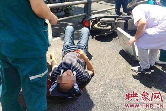 5月27日上午,鄭東新區(qū)平安大道商務(wù)外環(huán)路口附近,一年輕男子騎著電動車上班,因為灑水車剛經(jīng)過路面濕滑,男子不慎摔倒著地,頭部重傷造成大量出血。