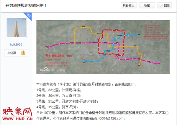 映象網(wǎng)快訊(記者 阮海峰 文/圖)網(wǎng)絡(luò)上謠傳“開封要修建地鐵,市區(qū)內(nèi)規(guī)劃了4條線路”近日不少開封市民在網(wǎng)上看到一則關(guān)于開封要修建地鐵的消息,引來一片熱議,同時(shí)市民在論壇上也有發(fā)帖熱議。11月2日,映象網(wǎng)記者隨即向開封市發(fā)改委求證,得知這一消息目前暫無定論,同時(shí)也希望大家不要再傳播.