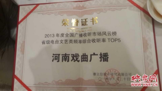 2014年8月20日晚上,國內(nèi)知名廣播收聽率調(diào)查公司賽立信媒介研究有限公司在成都舉行發(fā)布會,授予河南電臺戲曲廣播娛樂976“2013年度全國廣播收聽率TOP5”榮譽稱號。