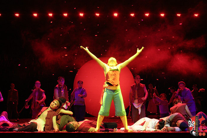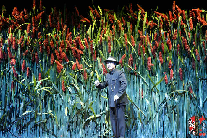 本劇以蓬蓬勃勃、充滿野性、有著旺盛生命力的紅高粱為意像,以九兒和十八刀的愛恨情仇為主線,描繪了上個(gè)世紀(jì)三、四十年代,先民們敢愛、敢恨、敢生、敢死的自由精神與生命氣度以及他們對(duì)入侵者不惜用鮮血和生命抗?fàn)?、可歌可泣而又悲壯慘烈的過程。最后九兒用高粱酒做炸藥,引爆了日本人的軍火車,軍火車的爆炸又扎爆了熟透了的高粱米,滿天都飄灑著絢麗的高粱花——這是他們的鮮血之花、靈魂之葩,更是他們精神的升華。
