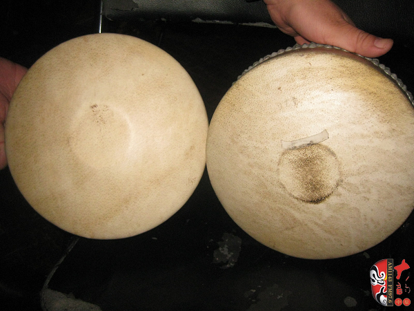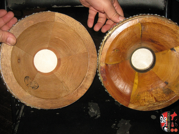 二團(tuán)著名的鼓師石振虎對(duì)于板鼓的使用非常講究 左邊是《程嬰救孤》專用的