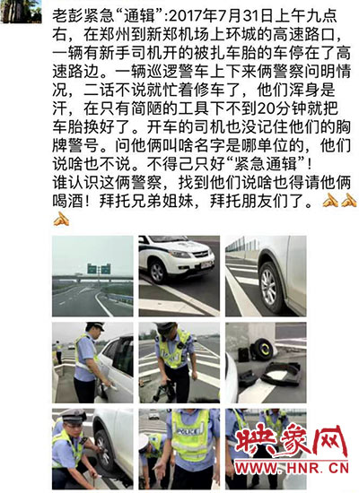 近日,在鄭州的朋友圈里轉(zhuǎn)發(fā)著一個(gè)“緊急通緝”的“尋人啟事”:2017年7月31日上午9點(diǎn)左右,在鄭州到新鄭機(jī)場上繞城的高速路口一輛有新手司機(jī)開的被扎車胎的車停在路邊。一輛巡邏警車上下來倆警察問明情況,二話不說幫忙修車,他們渾身是汗,在只有簡陋的工具情況下不到20分鐘就把車胎換好了。開車的司機(jī)也沒記住他們的胸牌警號,問他倆叫啥名字是哪單位的,他們說啥也不說,不得已只好“緊急通緝”。