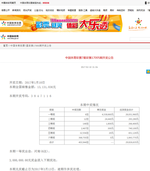 1月10日晚,七星彩第17005期開(kāi)獎(jiǎng),開(kāi)獎(jiǎng)號(hào)碼為3847116。當(dāng)期全國(guó)中出一等獎(jiǎng)6注,單注獎(jiǎng)金433.86萬(wàn)元,全部被河南彩民斬獲,總獎(jiǎng)金2600余萬(wàn)元,一次性掏空了全國(guó)獎(jiǎng)池。