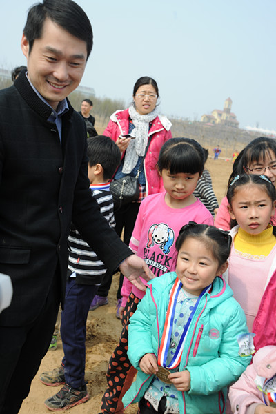 河南省體育彩票管理中心副主任韓宇為參加植樹的小朋友頒發(fā)獎牌