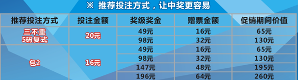 如中取二帶一獎(jiǎng)級(jí),除正常領(lǐng)取每注98元的獎(jiǎng)金之外,原贈(zèng)送16元體育彩票,活動(dòng)升級(jí)后,再多贈(zèng)送16元體育彩票,共贈(zèng)票32元,相當(dāng)于獎(jiǎng)金價(jià)值130元。