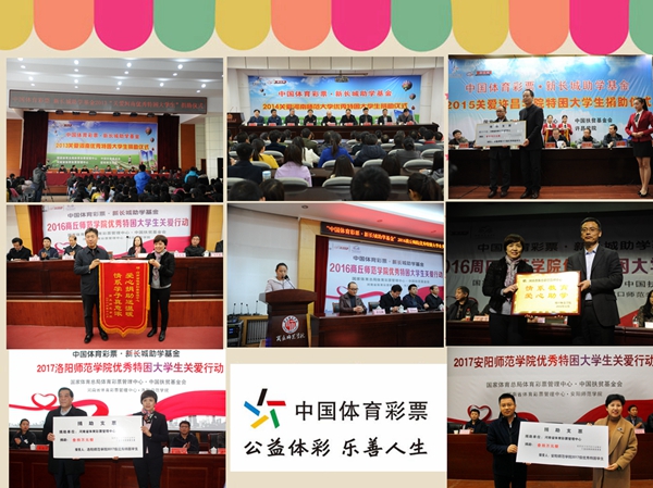 河南省體育彩票管理中心自2013年開始,已經(jīng)連續(xù)五年通過國家體育總局體育彩票管理中心與中國扶貧基金會合作,以“中國體育彩票·新長城助學(xué)基金”形式,向信陽師范學(xué)院、河南師范大學(xué)、許昌學(xué)院、商丘師范學(xué)院、周口師范學(xué)院、洛陽師范學(xué)院、安陽師范學(xué)院共計7所院校的400名優(yōu)秀貧困大學(xué)生累計捐助助學(xué)金200萬元。2015年,河南體彩中心在前兩年每年捐助50名貧困大學(xué)生的基礎(chǔ)上,將受助名額增加到了60名,2016年開始又將捐贈學(xué)校從一所增加到兩所,受助學(xué)生名額從60名又增加到120名,每個學(xué)生的受助金額從4000元提高到了5000元,希望幫助更多的困難學(xué)生及其家庭減輕經(jīng)濟負擔和精神壓力。