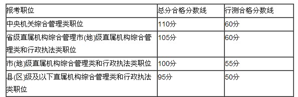 其中,報考中央機關(guān)綜合管理類職位的合格分數(shù)線較去年相比有所提高,總分不低于110分,且行政職業(yè)能力測驗不低于60分。分數(shù)線劃定如下表: