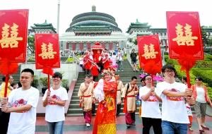 大紅花轎、鳳冠霞帔、媒婆丫鬟……昨天上午,重慶人民廣場(chǎng)上,喜慶的鑼鼓、嗩吶聲吹得熱鬧,一支特殊的迎親隊(duì)伍引來(lái)了眾多市民的圍觀。