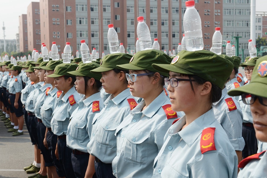 2015年9月17日,河南鄭州航空工業(yè)管理學院進行新生軍訓,記者軍訓現(xiàn)場發(fā)現(xiàn),該院在站軍姿、踢正步等軍訓項目上,引入卷尺、純凈水瓶等“裝備”,而且為“準空姐”訓練的科目中,還增加了如何盤發(fā)等項目。圖為2015年9月17日,鄭州航空工業(yè)管理學院的新生在頭頂?shù)V泉水瓶站軍姿。