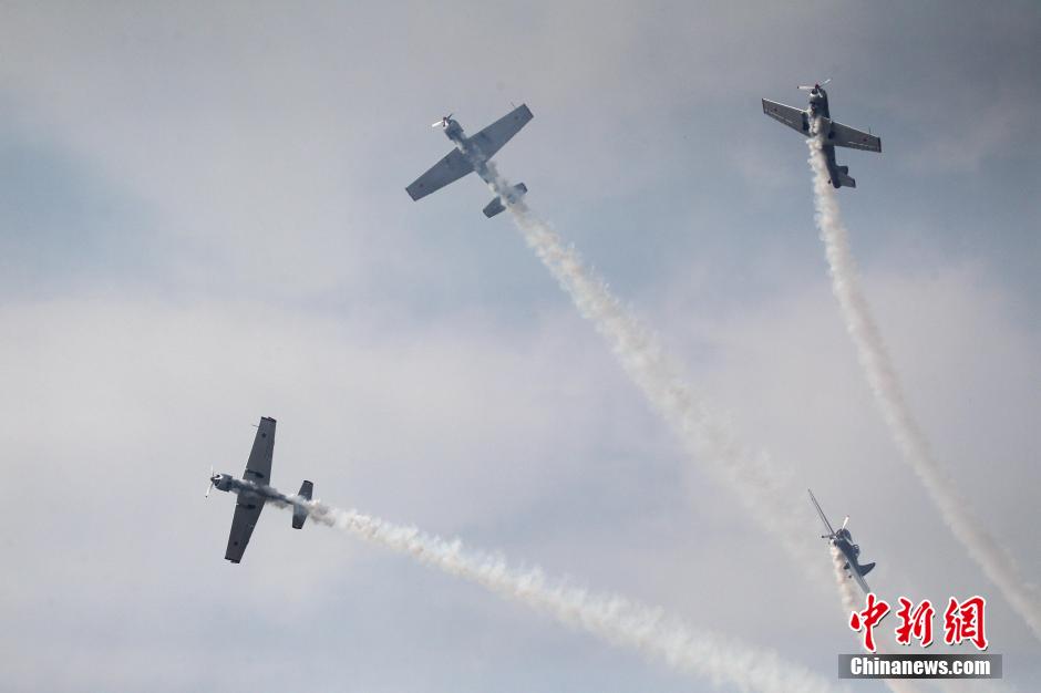 9月24日,河南鄭州上街機(jī)場(chǎng),參加2015鄭州航展的特技飛行員們,穿云破霧在加緊練習(xí)表演動(dòng)作,沖刺9月25日開(kāi)幕的鄭州航展。中新社記者 王中舉 攝