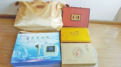 記者在經(jīng)三路和緯二路交叉口一小區(qū)內(nèi),見到了劉大媽領回的禮品。除大米、食用油、蜂蜜、刀具外,劉大媽還領了保健鞋、軟玉墊、治療儀、金碗筷,以及向天果、靈芝口服液保健品。其中僅兩盒口服液商家要了1萬元,其余全為贈品。劉大媽老伴說,他咨詢了專業(yè)人士,贈品加起來不值幾百元,口服液在藥店一盒也僅售幾百元,而在網(wǎng)上類似于靈芝口服液的產(chǎn)品一盒只要100多元。他拿起商家送的金碗,用手一摳,表層金黃色便被摳掉。