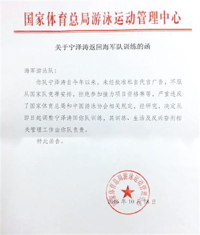 日前有媒體報道寧澤濤離隊的消息,并附有國家體育總局游泳運動管理中心內(nèi)部文件的照片,文件內(nèi)容為:“海軍游泳隊:你隊寧澤濤今年以來,未經(jīng)批準私自代言廣告,不服從國家隊競賽安排,拒絕參加接力項目資格賽,嚴重違反了國家體育總局和中國游泳協(xié)會相關(guān)規(guī)定,經(jīng)研究,決定從即日起調(diào)整寧澤濤回你隊訓練,其訓練、生活及反興奮劑相關(guān)管理工作由你隊負責。特此函告?!睍r間落款為2016年10月18日。
