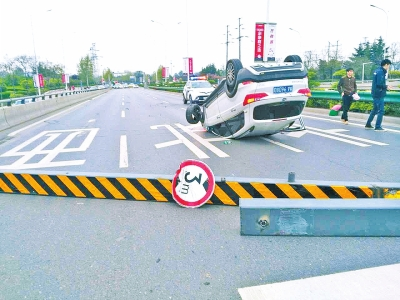 轎車軋過(guò)散落在地的限高桿后翻車