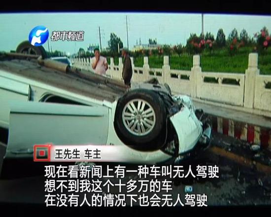 王先生說(shuō),當(dāng)時(shí)他將車(chē)停在路邊,準(zhǔn)備下車(chē)打電話,沒(méi)想到剛剛下車(chē),車(chē)就自個(gè)兒跑了。汽車(chē)一路“狂飆”,王先生眼睜睜地看著自己的轎車(chē)撞向路中間的轉(zhuǎn)盤(pán)。