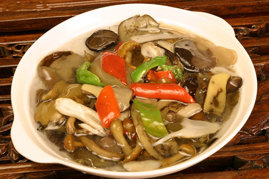 青松翠柏牛肝菌是用昆明特有的虎皮青椒,也就是云椒烹制的,肉厚味清香。在牛肝菌過油變色后立即加入云椒塊,大火爆炒,換小火加適量鹽即可出鍋。幾乎沒有其他調(diào)味料,純粹考驗食材的鮮香本味——醬香和清香相輔相成,天然去雕飾。