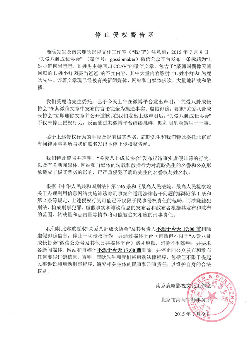 7月9日,關(guān)于“關(guān)愛八卦成長協(xié)會”微信公眾號發(fā)布“L姓小鮮肉當(dāng)爸爸”一文,影射鹿晗先生一事,鹿晗工作室發(fā)律師函否認(rèn)并警告其造謠生事,稱:“我們受鹿晗先生委托,已于今天上午在微博平臺發(fā)出聲明,“關(guān)愛八卦成長協(xié)會”在其微信文章中發(fā)布的言論完全為捏造誹謗,要求‘關(guān)愛八卦成長協(xié)會’立即刪除文章并公開道歉。在我們發(fā)出上述聲明后,‘關(guān)愛八卦成長協(xié)會’不僅未停止侵權(quán)行為,反而通過其微博平臺繼續(xù)挑釁,映射明星隱婚生子一事,鑒于行為惡劣,發(fā)出警告函。”