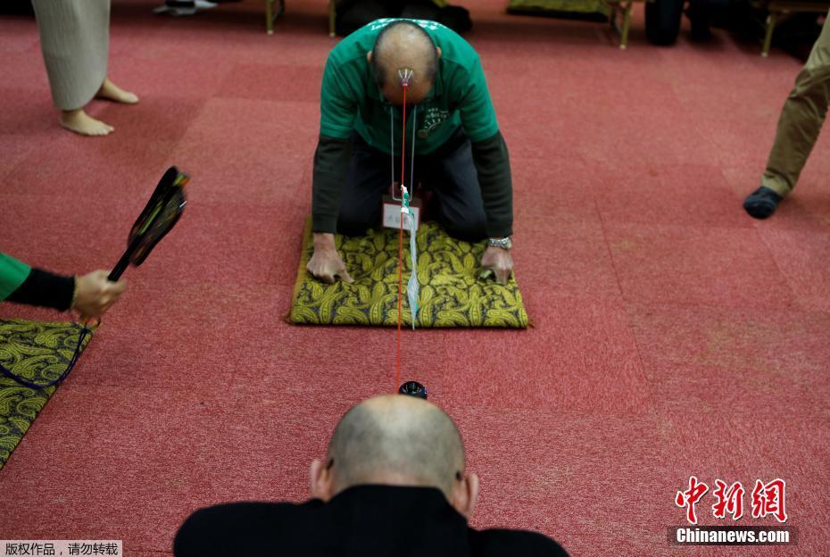 當(dāng)?shù)貢r間2月22日,日本一謝頂男人俱樂部里,成員將吸盤吸附在頭頂進行拔河游戲。