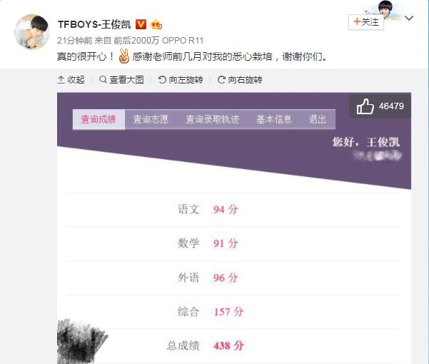 近幾日,2017年全國(guó)統(tǒng)一高考成績(jī)都陸續(xù)出爐,網(wǎng)友們非常關(guān)心的參加今年高考的TFboys王俊凱的成績(jī)今日也終于公布了!