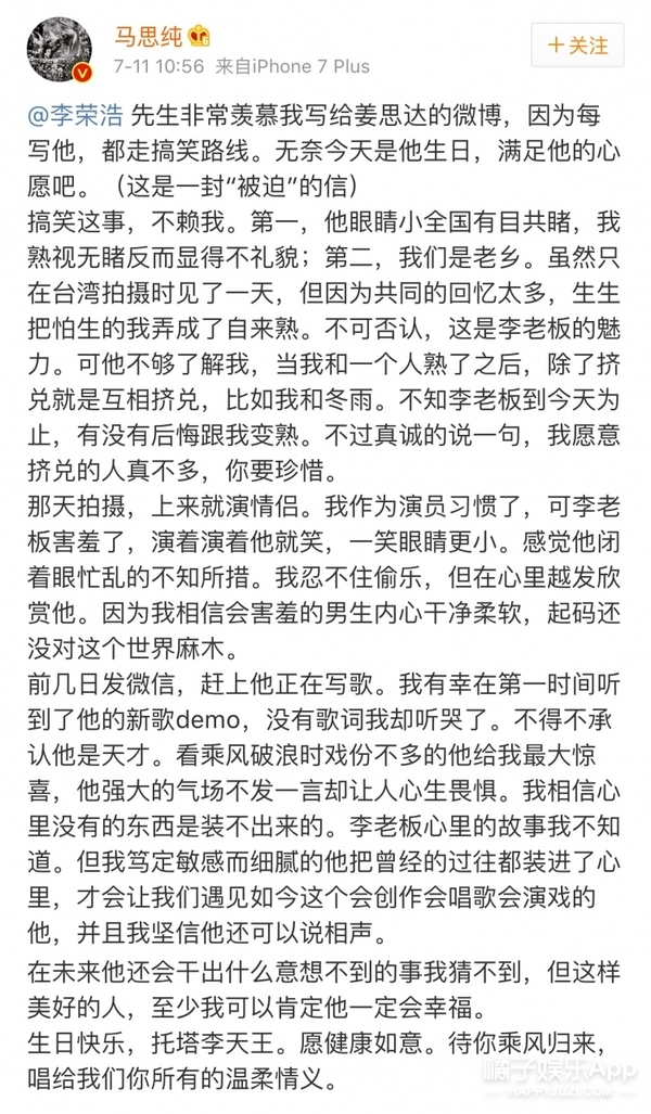 原來是因?yàn)轳R思純?cè)谖⒉懥艘环忾L(zhǎng)信祝福李榮浩的生日,她還調(diào)侃這是一封“被迫”的信。