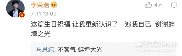 隨后李榮浩就在底下評(píng)論說馬思純的這篇生日祝福讓他重新認(rèn)識(shí)了自己,還稱她為“蚌埠之光”。而馬思純也回復(fù)他說“不客氣,蚌埠大光?!?/p>