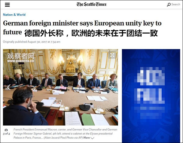據(jù)美國(guó)《西雅圖時(shí)報(bào)》30日?qǐng)?bào)道,德國(guó)外長(zhǎng)加布里爾在巴黎出席一次駐外使節(jié)會(huì)議上,呼吁歐洲應(yīng)當(dāng)團(tuán)結(jié)一致,制定出統(tǒng)一的對(duì)華戰(zhàn)略,也敦促中國(guó)不要試圖分化歐洲,而應(yīng)遵守“一個(gè)歐洲”原則。