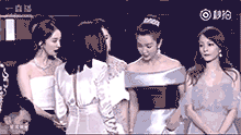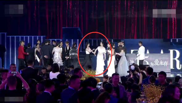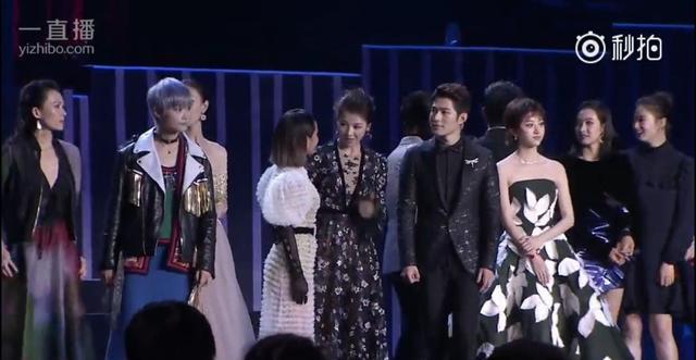 后來黃曉明隊(duì)和吳秀波隊(duì)的人一上來,舞臺上就滿了,而張韶涵的位置從劉嘉玲的右邊換到了劉嘉玲左邊,變成在李冰冰和劉嘉玲中間。可以看到她當(dāng)時(shí)也還是挺尷尬的。然后李冰冰和張韶涵身邊的劉嘉玲握手寒暄,張韶涵尷尬的站在原地。