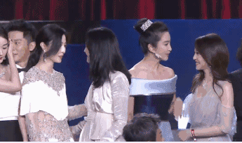 然后呢,大家都知道,雙冰是不會(huì)往一起站的,她們叫來了姚晨來破解這個(gè)尷尬。冰冰這是把大姚轉(zhuǎn)了一圈啊。