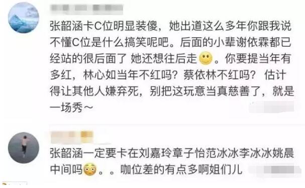 那么問題來了,張韶涵站了C位,是沒注意還是有心機(jī)呢?你怎么看