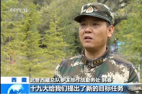 武警西藏總隊參謀部作戰(zhàn)勤務(wù)處 韓春:十九大給我們提出了新的目標(biāo)任務(wù),在新時代,作為守衛(wèi)祖國邊疆的武警官兵,按照習(xí)主席講的那樣,一定要有新氣象新作為,始終扎根高原、立足崗位,為實現(xiàn)強(qiáng)軍目標(biāo)作出積極貢獻(xiàn)。