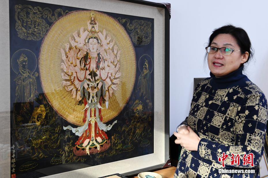 4月7日,蘭州文理學(xué)院女教師白茜介紹自己用萬(wàn)根金屬絲創(chuàng)作出的“千手千眼觀音”掐絲琺瑯畫(huà)。從小喜歡繪畫(huà)的白茜通過(guò)自己十幾年的摸索,以敦煌壁畫(huà)為范本制作掐絲琺瑯畫(huà)?!扒智а塾^音”是白茜最滿意的作品,用了萬(wàn)根一米左右的金屬絲臨摹完成。