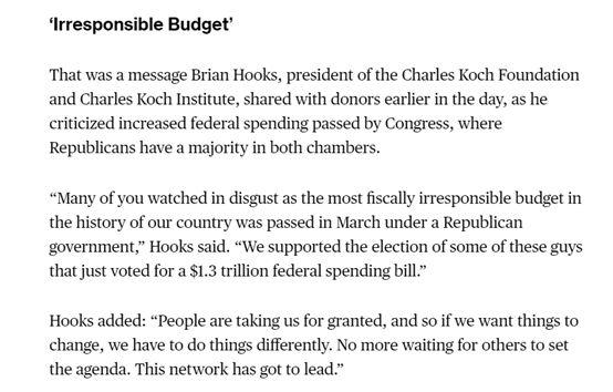 另外,科赫兄弟還表示他們不會再向以前那樣輕易支持共和黨的議員了,因?yàn)檫@些議員并沒有履行他們競選時的承諾,反而是一直在支持美國政府的一些違背市場的政策,比如在今年3月的一項(xiàng)加大政府財政開支的法案。
