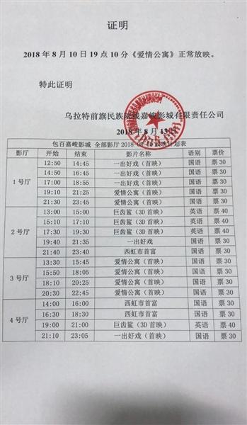 包百嘉峻影城給出影院排片來回應證明。