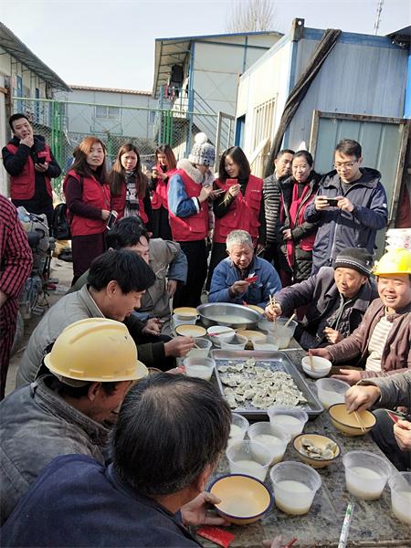 與此同時,第三路名嘴李璇和王澄也在鄭州市北建材附近的工地上行動了起來。他們帶著15名義工來到工地食堂,為民工兄弟們煮起了餃子。餃子出鍋,主持人李璇和王澄和民工兄弟們圍坐在一起,聊著天,品嘗熱騰騰的水餃。在現(xiàn)場,主持人還遇到了一位特殊的老人——劉春娥。劉老太太常年堅持義務(wù)給農(nóng)民工送衣服鞋墊,可以說,鄭州工地上的人都認(rèn)識這位老太太。今天,劉老太太正巧又給這里的工人們帶了40對新納好的鞋墊兒,前不久,老太太才送來了不少衣物。拿著新鞋墊,吃著熱餃子,民工兄弟們個個笑開了花。